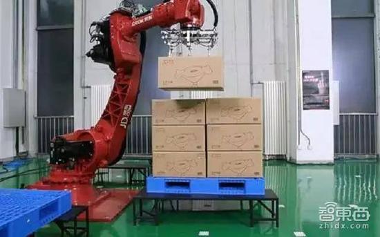 京东无人仓内六轴机器手臂在码放货物,右侧货架由Shuttle货架穿梭车负责搬运