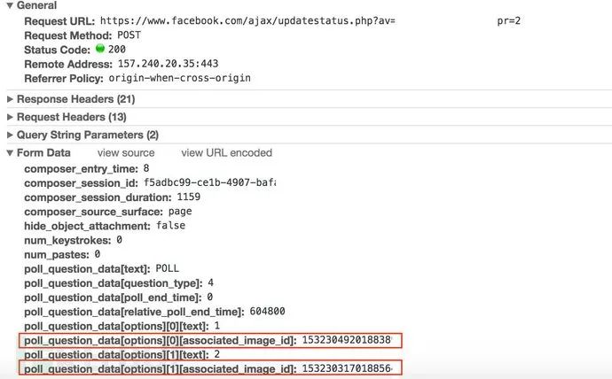 当用户创建一项包含图片的投票询问分享后,会向Facebook发送一个GIF链接或图片编号的请求,也就是poll_question_data[options][][associated_image_id] ,其中末尾包含了上传图片的id: