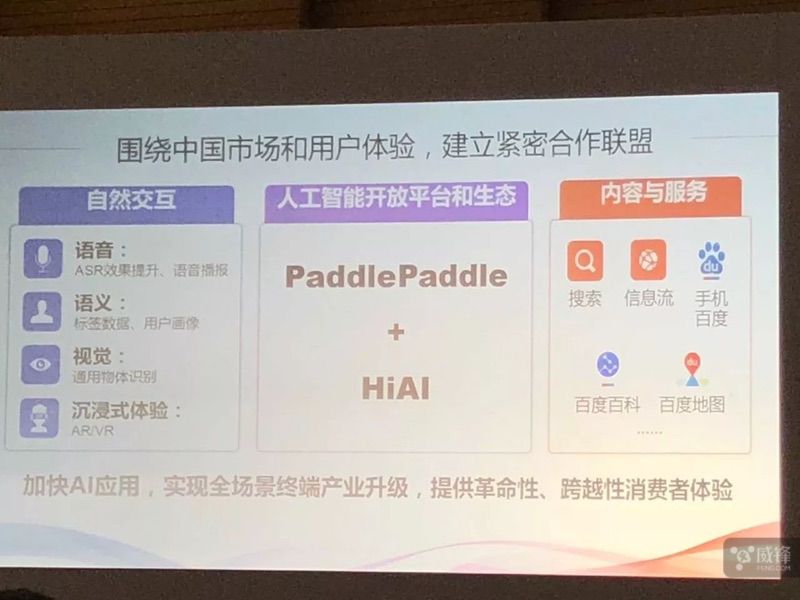百度董事长兼 CEO 李彦宏和华为消费者业务副总裁余承东都出席了合作仪式,李彦宏表示:“百度和华为走到一起应该不令人意外,因为我们两家有很多相似的地方。”同时他还强调了百度的 AI 技术加上华为的用户基数,一定能够做到很多过去做不到的事情。