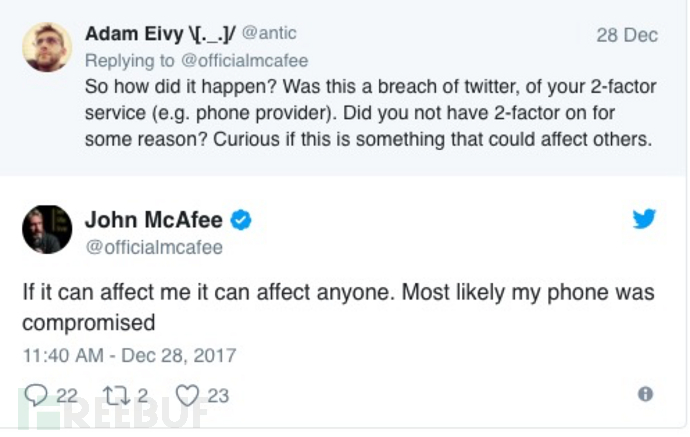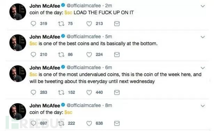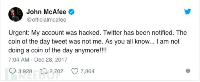 据悉,账户被黑后,黑客利用McAfee的影响力发了多条推广加密货币的推文,如Siacoin, NXT, XRP, PTOY, and BAT等等。John McAfee表示,自己的twitter账户采用了双因素认证保密机制,此次被黑意味着黑客已经找到获取twitter验证码的方法,并且极有可能是通过攻击移动设备或者基于七号信令系统攻击(SS7 attack)来实现的。