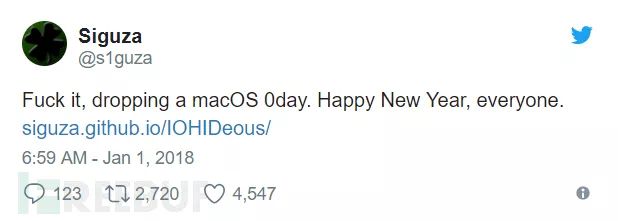 2017 年 12 月 31 日,一名推特账号为 Siguza 的安全研究人员公布了 macOS 0-day 漏洞的详情。该漏洞是一个本地提权漏洞,影响到所有 macOS 版本,主要涉及人机接口设备(如触摸屏、按键、加速度计等)的内核驱动程序 IOHIDFamily。攻击者利用这个漏洞可以在在内核中进行任意读/写,并执行任意代码、获取 root 许可,进而彻底接管系统。据 Siguza 推测,漏洞可以追溯到 2002 年。