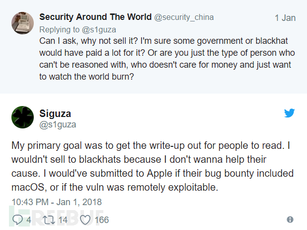 我的主要目的是让人们知道这个漏洞。我不会把 exploit 卖给黑客,因为我不想助纣为虐。如果苹果的漏洞奖励计划包含 macOS 的漏洞,或者这个漏洞出现远程利用的实例,那我早就把这个漏洞提交给苹果了。