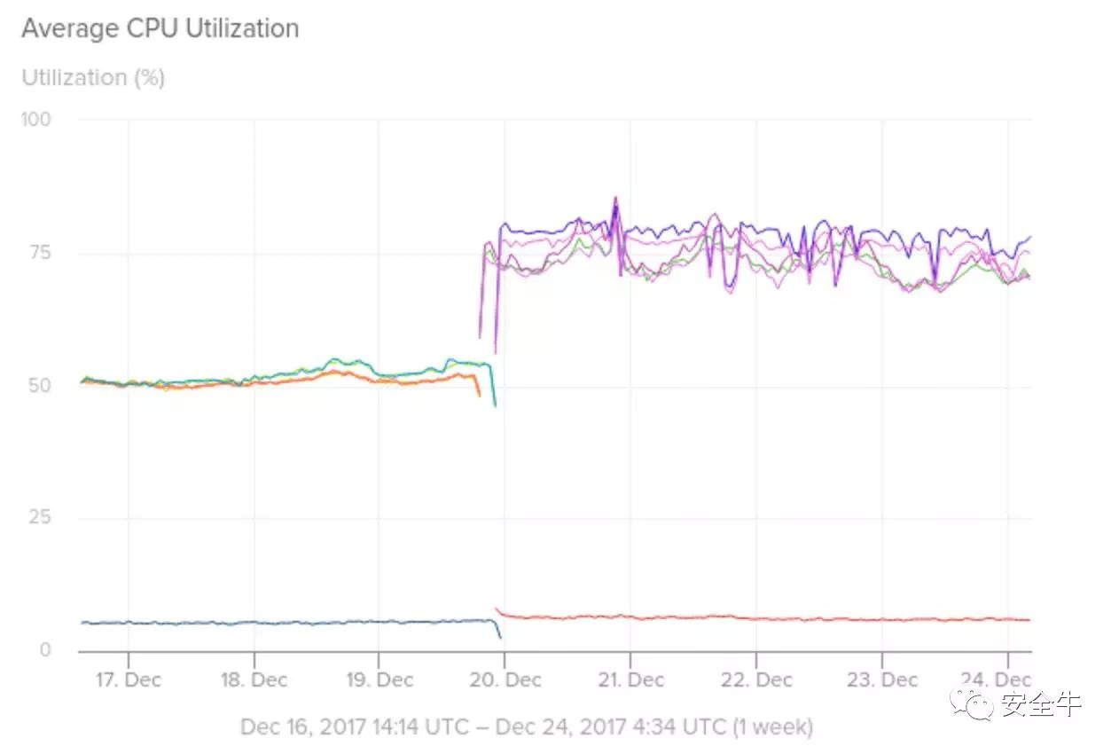 该公司还观察了其弹性计算云(EC2)实例在不同AWS可用域上随该补丁的推出而产生的CPU使用率变化(如下图所示),结果并不好看: