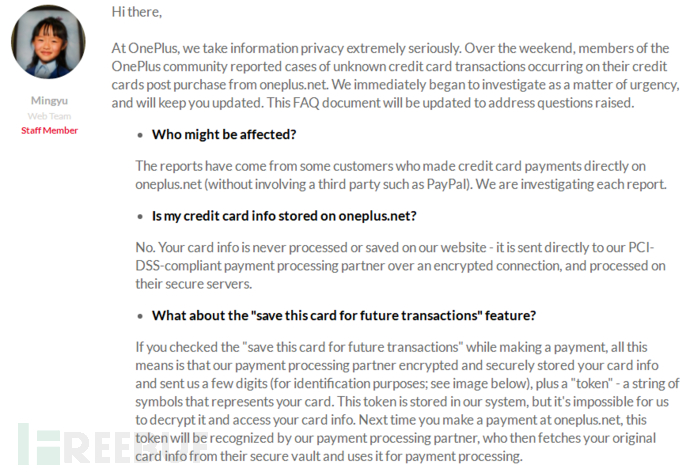 一加在其论坛上迅速回应了这个问题,声明它不在其网站上存储任何信用卡信息,所有支付交易都通过其符合PCI-DSS的支付处理合作伙伴进行。
