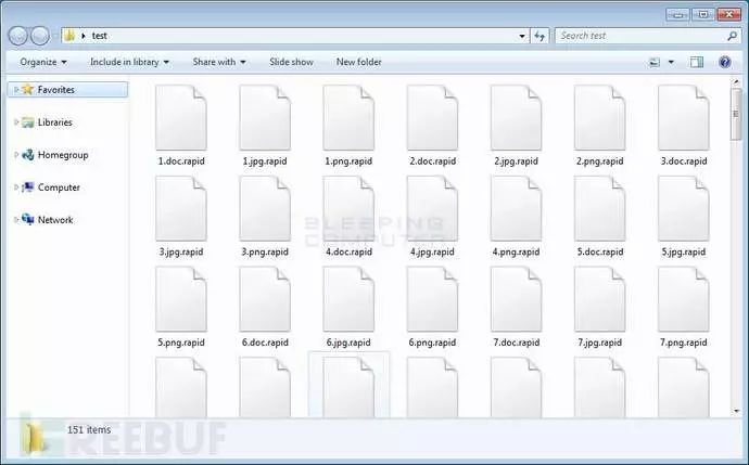 一旦这些命令被执行,恶意软件就会扫描计算机进行加密,当文件被加密后,其文件名就会被添加.rapid扩展名,如下图: