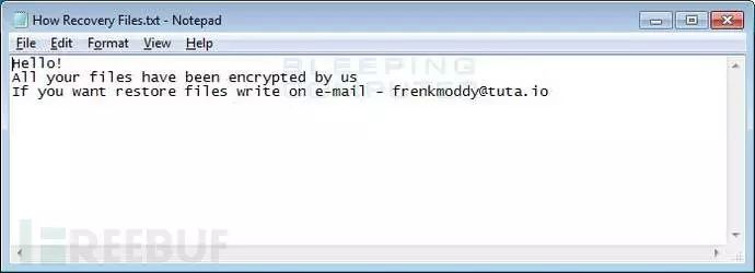 Hello! All your fileshave been encrypted by us Ifyou want restore files write on e-mail - frenkmoddy@tuta.io