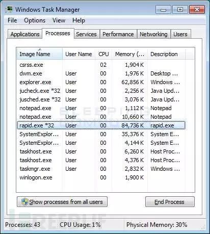受害者如果发现Rapid恶意软件对计算机进行加密后,应尽快打开Windows进程管理器,终止关联的恶意进程。如果计算机没有被重启,运行的进程名称可能为任意名称,如样本的名称为rapid.exe(如下图)。如果受害者计算机已经被重启,这个进程名称可能被命名为info.exe。