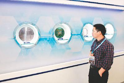 2017年10月25日,在上海举办的中国电子展上,参观者在观看一个由纳米光罩和晶圆凸块等芯片制造材料组成的展示墙。