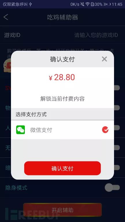 腾讯移动安全实验室APP威胁情报项目组发现一个吃鸡辅助器的欺诈样本,用户需支付一定金额开启外挂功能,但该样本本身并没有外挂功能。因涉及诈骗用户钱财,建议关注。