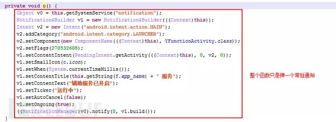 3. 点击开启辅助后,通知栏会有一个常驻通知“吃鸡辅助器 服务-辅助服务已开启”,但从反编译的代码看,除了弹常驻通知,并没有其他操作,且所有游戏外挂功能都是同样的处理逻辑。