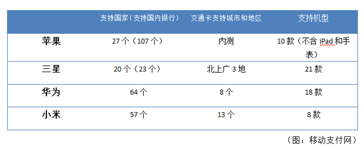 国内NFC支付的代表华为、小米则将手机移动支付业务充分利用起来,而且结合国内市场,推出了手机交通卡业务,将支持银行、城市和机型不断拓展。目前,华为和小米在金融方面的支持银行都达到了近60家,国内大部分主流银行都能完成开通。在交通支付领域,支持地区方面小米略胜一筹,而支持设备上,华为则稍微领先。双方你来我往,将会持续推进自家移动支付业务的发展和布局。