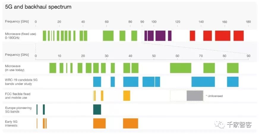 毫米波范围是从30G~300GHz。世界范围内新的5G频谱分配,范围从20几GHz(例如26GHz和28GHz,它们技术上不是毫米波,但通常被归入该类),到30G~40GHz内的几个频段和40G~50GHz内的几个频段。有一个60GHz的Wi-Fi频段可用于5G无线,其他更高的频率正在考虑中。