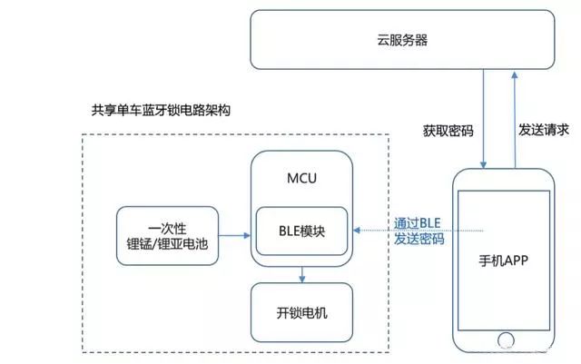 像ofo的第一代单车,只有一个密码锁,每个车子固定的密码、固定的ID号。手机扫码、上传服务器、服务器查找该车辆对应的密码、下发给手机APP,用户根据这个密码来解锁车辆。
