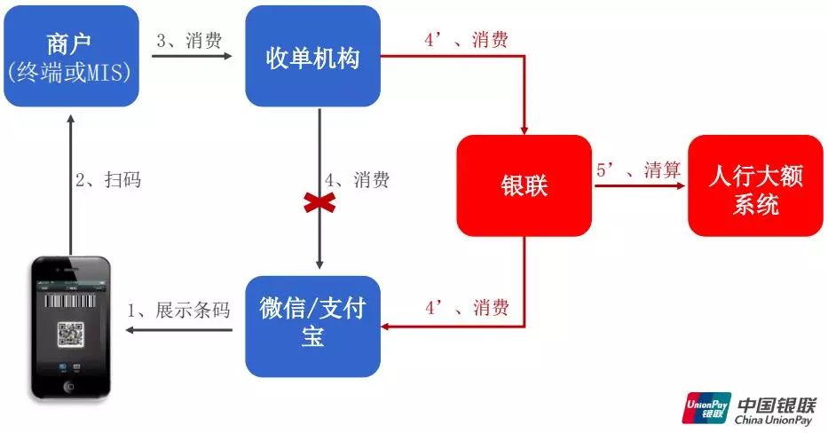 从资料来看,微信、支付宝接入银联后,收单机构和微信、支付宝间的消费联系被切断,它们之间的商户进件和交易将交由银联来处理。而银联背后则通过人民银行大额系统进行资金清算,彰显了这一模式在政策上的合法性。