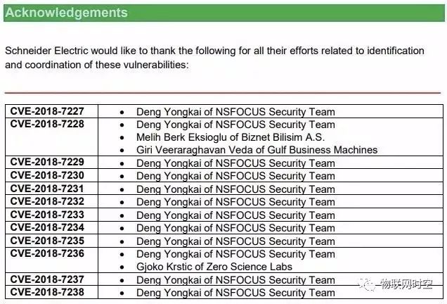 2018年2月27日,施耐德发布摄像头安全公告,提醒客户升级固件。同时,施耐德致谢绿盟科技,感谢公司物联网安全研究员发现了12个安全漏洞,提升了产品的安全性。
