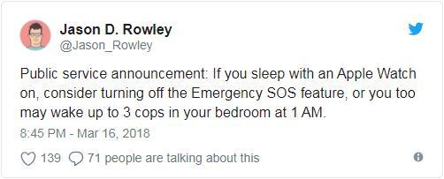 如果你佩戴Apple Watch时的睡觉姿势不正确,那么有可能在朦胧中接到来自警方的起床铃。这并不是段子,因为一位名叫Jason Rowley的网友,就在Twitter上吐槽了他几天前的遭遇。 事发地点在卧室,时间为凌晨1点。原本他只想把手表作为睡眠追踪器,但却不慎碰到表冠按钮并触发了报警电话。Rowley表示,警方非常友好和乐于助人,并称他们经常接到WatchOS错误拨出的此类电话。
