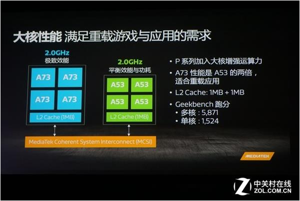 联发科P60拥有4个A73和4个A53,这次重点提升了大核的运算能力,大核频率达到2.0GHz。而且引入了联发科的MediaTek Coherent System Interconnect,将8颗核心的性能分配到最优。