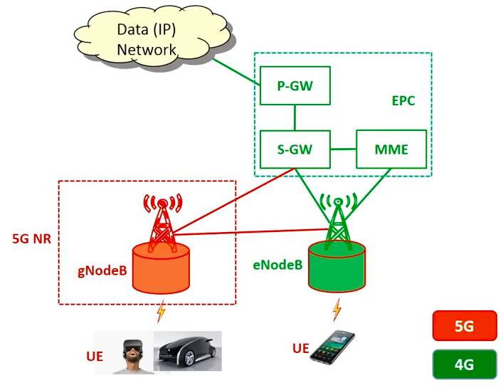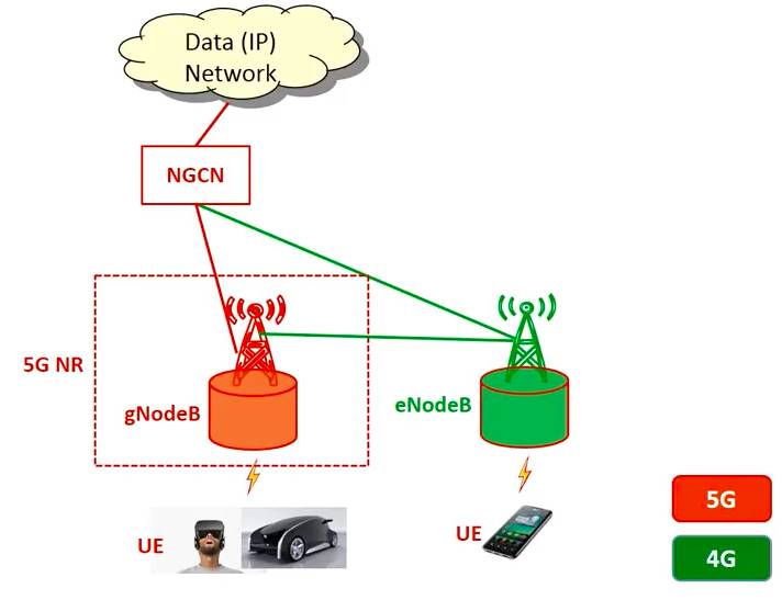 第一步,5G NR(新无线)先行,5G基站(gNodeB)与4G基站(eNodeB)以双连接的方式共同接入4G核心网。