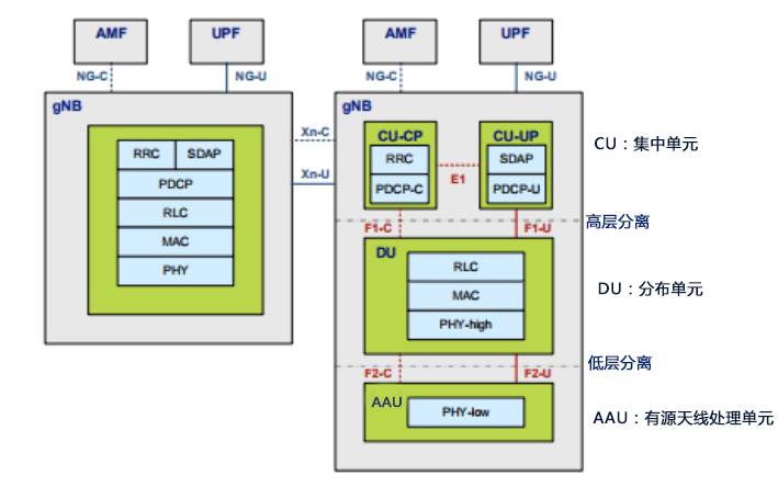 如上图所示,首先是控制面和用户面的分离;其次是基站被分离为三部分:AAU、DU和CU。