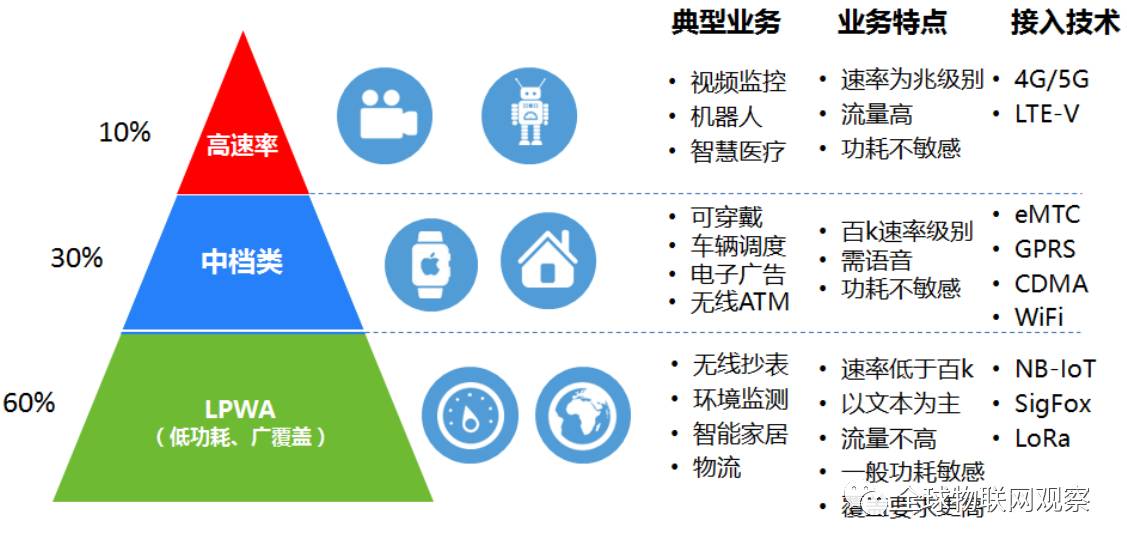 以上是按流量计费的方式。但根据应用场景不同,物联网的需求可以分为高速、中档、低功率广覆盖三层,而低功率广覆盖所在的层级具备覆盖 90%业务场景的能力。