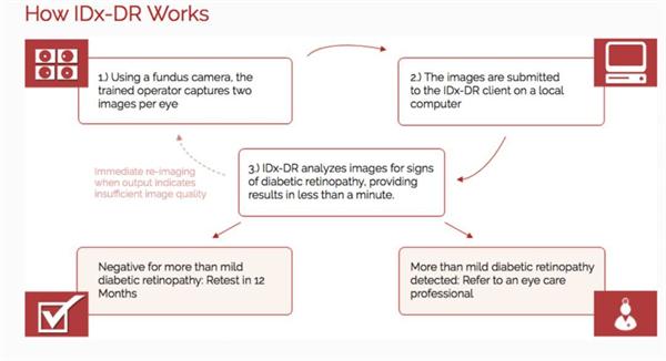 它的工作原理如下:护士或医生上传用特殊视网膜照相机拍摄的患者视网膜照片;IDx-DR软件算法首先指示上传的图像是否具有足够高质量以获得结果;然后,它分析图像以确定患者是否患有糖尿病性视网膜病,糖尿病性视网膜病是一种眼睛疾病,主要是过多的血糖损害眼睛后面的血管。