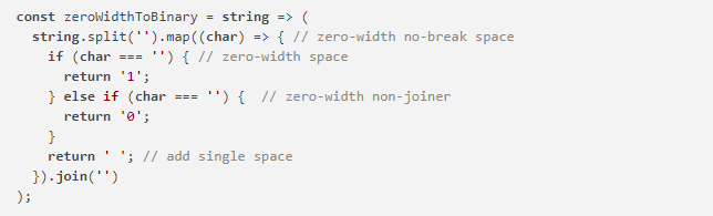 2 把这些经过二进制转换的用户名字母转换为零宽度字符。该过程中,二进制串中的每个1转换为零宽度空格,每个0转换为零宽不连字符(zero-width-non-joiner),每个字母完成转换后再在其后面加上一个零宽连字符(zero-width joiner ),然后再对下一个字母进行类似转换。