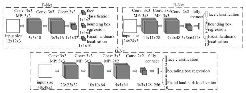 对于人脸检测,研究人员们主要使用了MTCNN(Multi-task Cascaded Convolutional Network)网络,这一架构包含三个主要的部分分别是通过图像金字塔提出候选框的建议网络P-Net、随后是用于提炼优化结果的精炼网络R-Net,最后是用于生成最终人脸框和五个标志结果的输出网络O-Net。