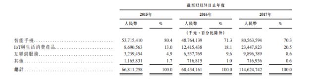 在业务收入上,招股书显示,小米收入主要来自四大业务:智能手机、IoT与生活消费品、互联网服务以及其他。其中,2017年的业务中,智能手机部分收入为805亿元,占比70.3%。IoT与生活消费产品收入为234亿元,占比20.5%。互联网服务部分收入98.9亿元,占比8.6%。雷军一度强调,小米永远坚持硬件综合净利率不超过5%。