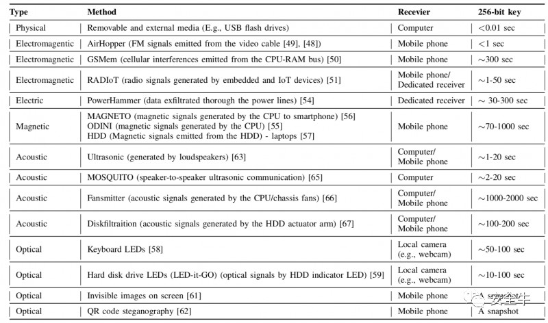 一旦攻击者在托管钱包的物理隔离主机上建立了据点,他们就可以利用隐秘信道渗漏私钥。这些信道可分为7类:物理的、电磁的、电子的、磁场的、声学的、光学的和热力学的。渗漏速度从1秒以内到数分钟不等。