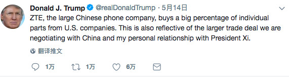 上周日,特朗普发推文,他正在和中国最高领导人一起努力,寻求让中兴快速恢复业务的办法。并称中国有太多人失业,商务部已经开始解决中兴问题了。