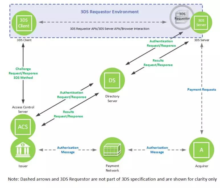 不要被繁杂的箭头和英文所吓倒,我们来逐步揭开3DS的神秘面纱。首先要强调的是,3DS是一个只处理身份验证报文的协议,而上图中虚线箭头连接的流程都是授权相关的,所以这些其实是3DS验证通过后为完成整个交易流程而执行的后续步骤,不包含在3DS标准中。所以,3DS的相关验证报文只在3DS Client、3DS Server、Directory Server(DS)、Access Control Server(ACS)四个组件中进行转发。