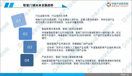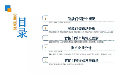 《2019年中国智能门锁行业市场前景研究报告》主要围绕智能门锁行业概况;智能门锁市场分析;智能门锁市场促进因素;重点企业分析;智能门锁行业发展前景等五个章节展开,通过对当前智能门锁行业进行分析,总结智能门锁行业发展现状,从而预提出当前行业的发展前景。
