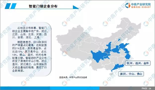 从地区分布来看,智能门锁企业主要集中在广东、浙江、江苏,山东、北京、河南、四川、安徽、湖北、上海。据数据显示,2018年深圳的产销量占比最高,达到全国的21%左右,其后是金华,占比达19%,其次是中山,占比18%。佛山、温州、杭州也有较高分额。智能锁的产业分布改变了原有的中山小榄,浙江温州,浙江浦江,山东烟台四大锁业基地的格局,展现了行业新局面。