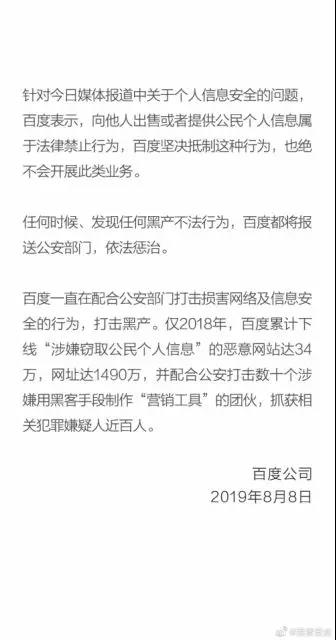 针对今日媒体报道中关于个人信息安全的问题,百度表示,向他人出售或者提供公民个人信息属于法律禁止行为,百度坚决抵制这种行为,也绝不会开展此类业务。