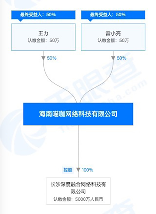 天眼查资料显示,长沙深度融合是海南喵咖网络科技有限公司(海南喵咖)的全资子公司。而王力和雷小亮各持海南猫咖50%的股份。王力为陌陌公司董事、总裁及COO,雷小亮则为陌陌公司联合创始人兼游戏业务部总裁。