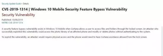 目前已经有工程师成功利用该漏洞访问用户 手机 相册,并在不需要进行系统身份认证的情况下修改和删除照片。该工程师表示:“这个漏洞可以绕过Windows 10 Mobile系统中的安全功能,在锁屏状态下通过Cortana访问文件和文件夹。”而想要利用该漏洞,攻击者需要物理接触到手机并且需要在锁屏界面上启用Cortana。