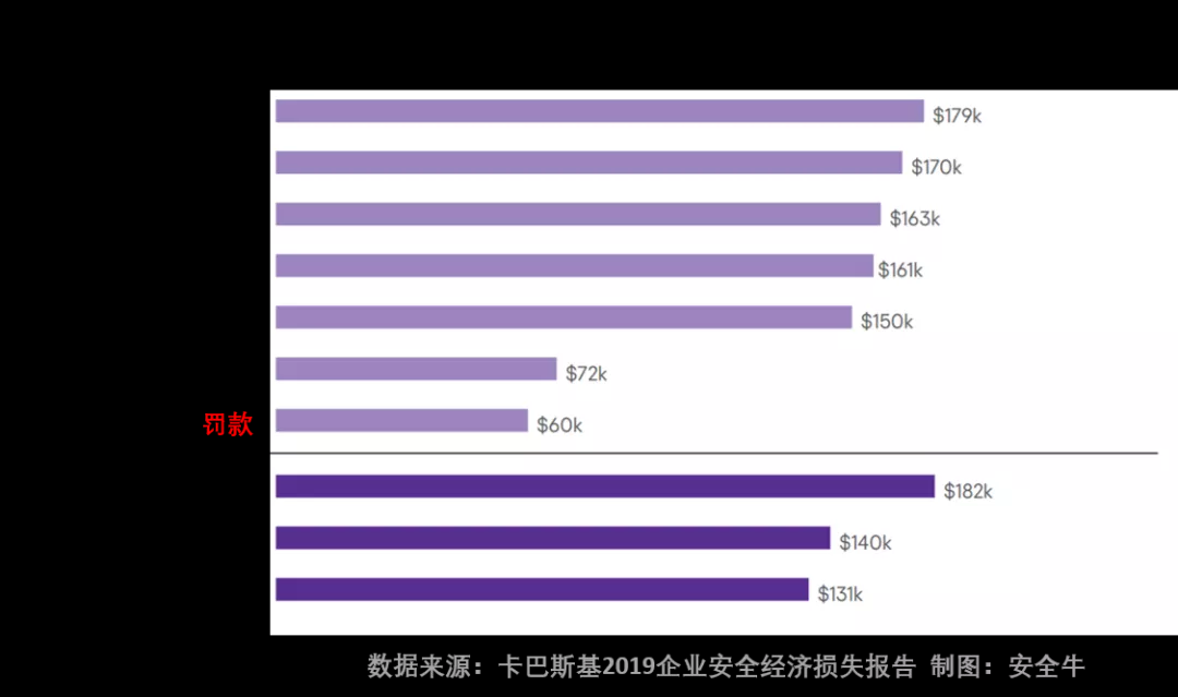 值得注意的是,罚款在企业数据泄露损失中所占的比例很少,根据卡巴斯基 2019 年的企业数据泄露成本分析报告(下图),企业数据泄露事故损失的前五项分别是:信用/保险损失、外部专家招聘、业务损失、公关成本和内部(安全岗位)加薪。