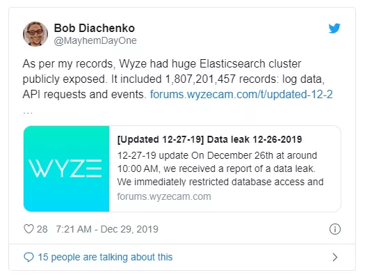 Wyze确认泄露的服务器暴露了详细信息,例如用于创建Wyze帐户的客户电子邮件地址,分配给Wyze安全摄像机的昵称用户,WiFi网络SSID标识符以及对于24000位用户而言的Alexa令牌,这些令牌将Wyze设备连接到Alexa设备。