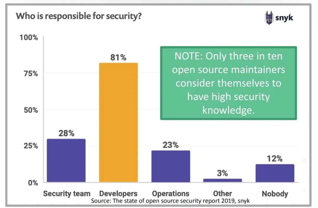随后,他还对 “哪些人应该对安全负责” 进行了数据调查和分析,数据调查结果如下图所示,有81%也就是大部分的受调查者认为安全责任还是应该由开发者承担,只有21%的受调查者认为责任应该由整体团队组织负责。Romeo认为这个数据表示了大部分的人依旧还是没有把安全责任从单一的开发人员上转移到团队中去,这表示开发人员面临着巨大压力。