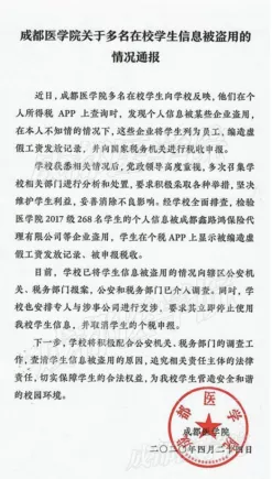 24日上午,成都医学院进行了回应,其表示,经学校全面排查,检验医学院2017级268名学生的个人信息被成都鑫路鸿保险代理有限公司等企业盗用。当日,成都医学院学生“被发工资”的公司——成都鑫路鸿保险代理有限公司回应称,对涉及错误的学生名单全部撤销,将对直接责任人予以开除处理。