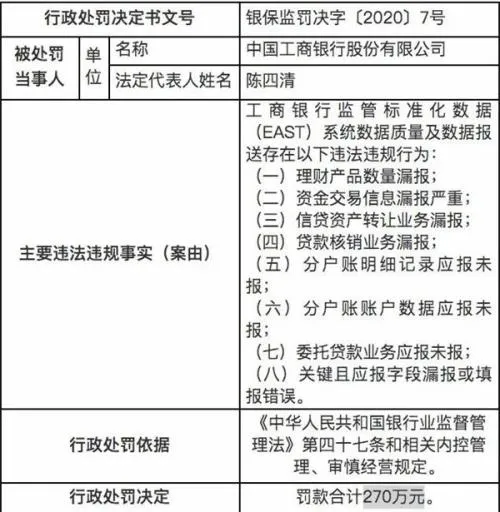 2020年5月9日,中国银保监会披露一批罚单,包括6家国有大行,2家股份制银行在内的8家银行被罚了1770万元。被罚原因是,监管标准化数据(EAST)系统数据质量及数据报送存在违法违规行为,比如理财产品数量漏报、资金交易信息漏报严重等。