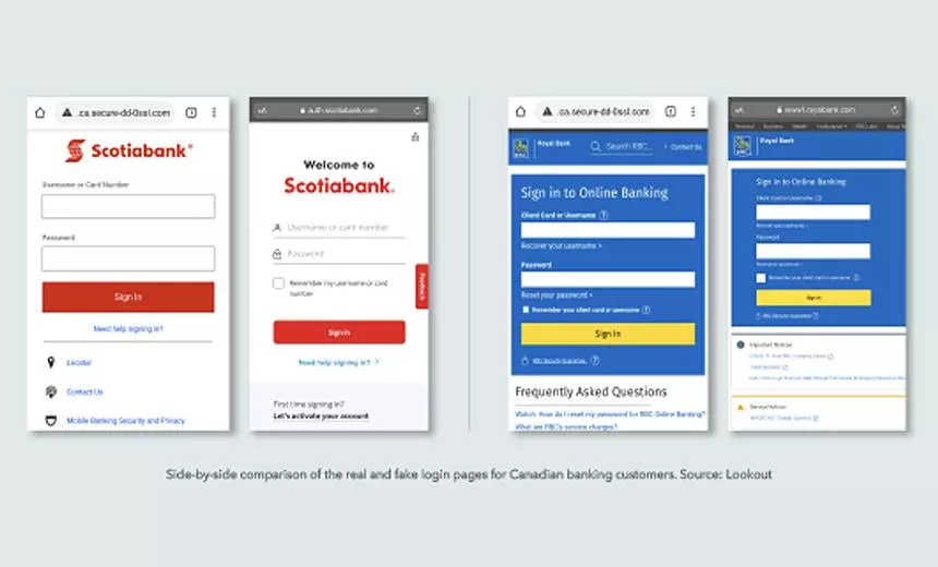 该报告还指出,尽管这些移动网络钓鱼活动大多针对各种部门,包括医疗保健、制造业和政府机构等展开,但是值得注意的是,旨在窃取银行客户信用凭证的攻击也正在激增。例如,该报告展示了针对两家加拿大银行(Scotiabank和Royal银行)的移动网络钓鱼活动的登陆页面(如下所示)。