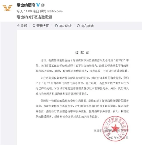 维也纳酒店表示,近日,有媒体报道维也纳3好酒店旗下加盟酒店苏州太仓港店“差评门”事件。该门店员工在客诉处理过程中的不当言论和行为,给住客带来非常不好的体验和恶劣影响。对此,我们作为品牌管理方,深表震惊,并向该住客诚挚道歉。