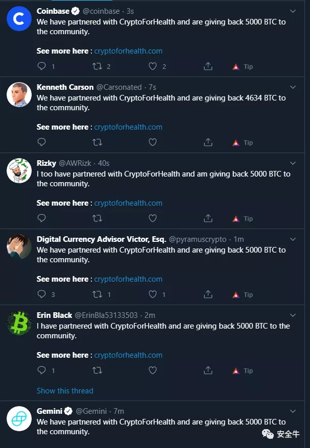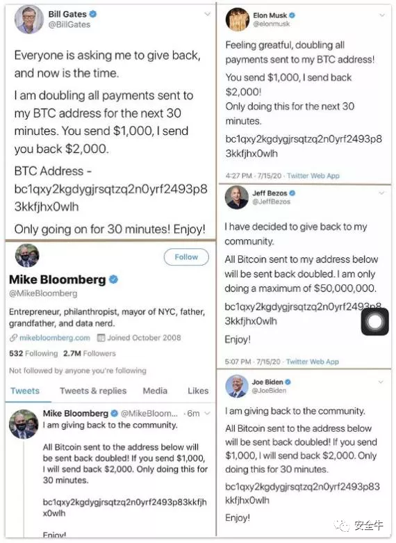 攻击者同时劫持了比尔·盖茨、埃隆·马斯克、巴拉克·奥巴马、杰夫·贝佐斯、乔·拜登、迈克·彭博、苹果、优步的Twitter账户以及加密货币交易所Binance、Coinbase、KuCoin和Gemini、CoinDesk等顶级加密货币媒体账户,并发布了骗取加密货币的虚假推文: