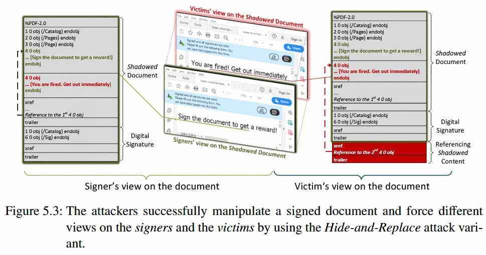 研究人员说,阴影攻击是可能的,因为PDF文档,即使是数字签名,也允许未使用的PDF对象出现在它们的内容中。