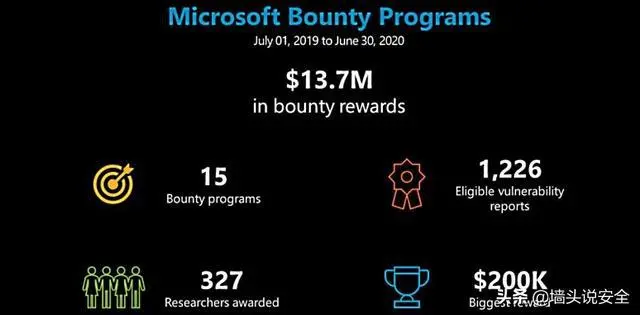 在 2019 年 7 月 1 日至 2020 年 6 月 30 日期间,微软已通过 15 个漏洞赏金计划向已报告漏洞的安全研究人员提供了 1,370 万美元的奖励。