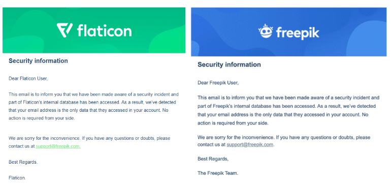 该公司表示,他们正在根据失窃内容,通过定制邮件通知所有受影响的用户。这些邮件将发送给Freepik和Flaticon的用户,具体取决于用户注册的服务。Freepik说。“使用bcrypt散列密码的用户收到一封电子邮件,提示他们更改密码,特别是在密码容易被猜到的情况下。只有电子邮件泄漏的用户会收到通知,但无需采取任何特殊措施。”