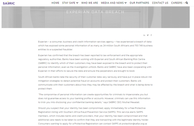 Experian补充说,其调查表明,犯罪嫌疑人打算利用这些数据来创建营销线索以提供保险和信贷相关服务。目前已有银行已告知客户更改密码,或前往南非欺诈预防服务中心进行登记。多家银行表示切勿将个人信息透露给给客户打电话,发电子邮件或发送短信的任何人。银行绝不会与客户联系以获取此类信息。切勿点击声称来自各银行电子邮件中的链接或者附件。
