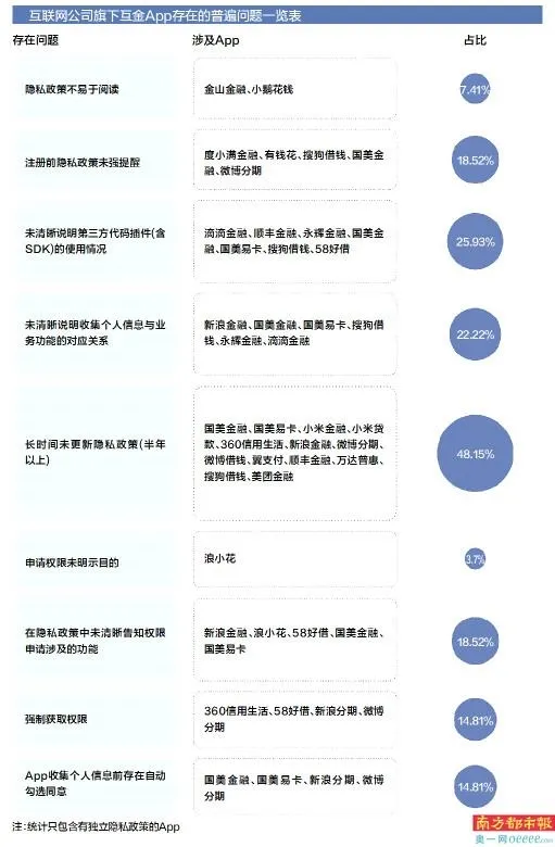 结果显示,互联网综合性生活服务App上的嵌入型金融服务端口普遍存在隐私条款缺失的情况,个人信息收集的规范性有待加强;而25个独立App中,国美、新浪系App安全问题暴露明显,排名垫底。