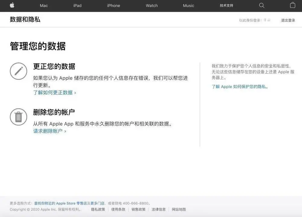 打开“数据和隐私”页面,用户能够自主更新个人数据或删除账户 | Apple